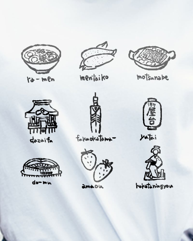 「FUKTOP9」Tシャツは、福岡の名所、名物、特産品をユニークなイラストでデザインしたオリジナルTシャツです。福岡の魅力がギュッと詰まった、地元愛を表現したい方や観光のお土産としてぴったりの一枚です。
